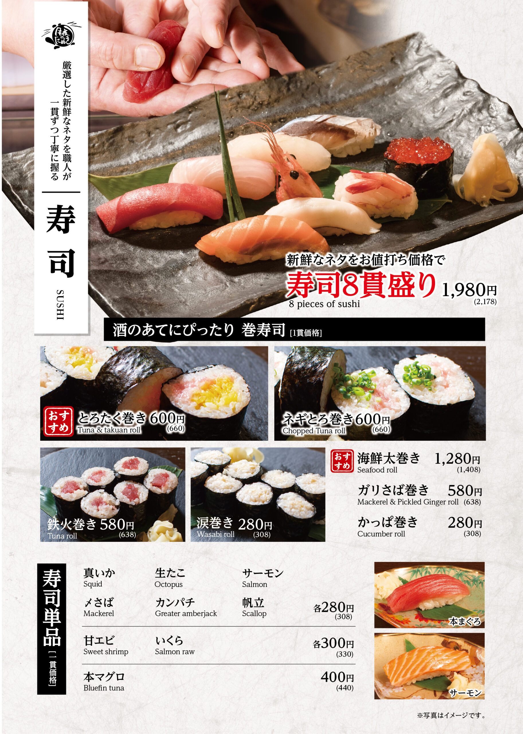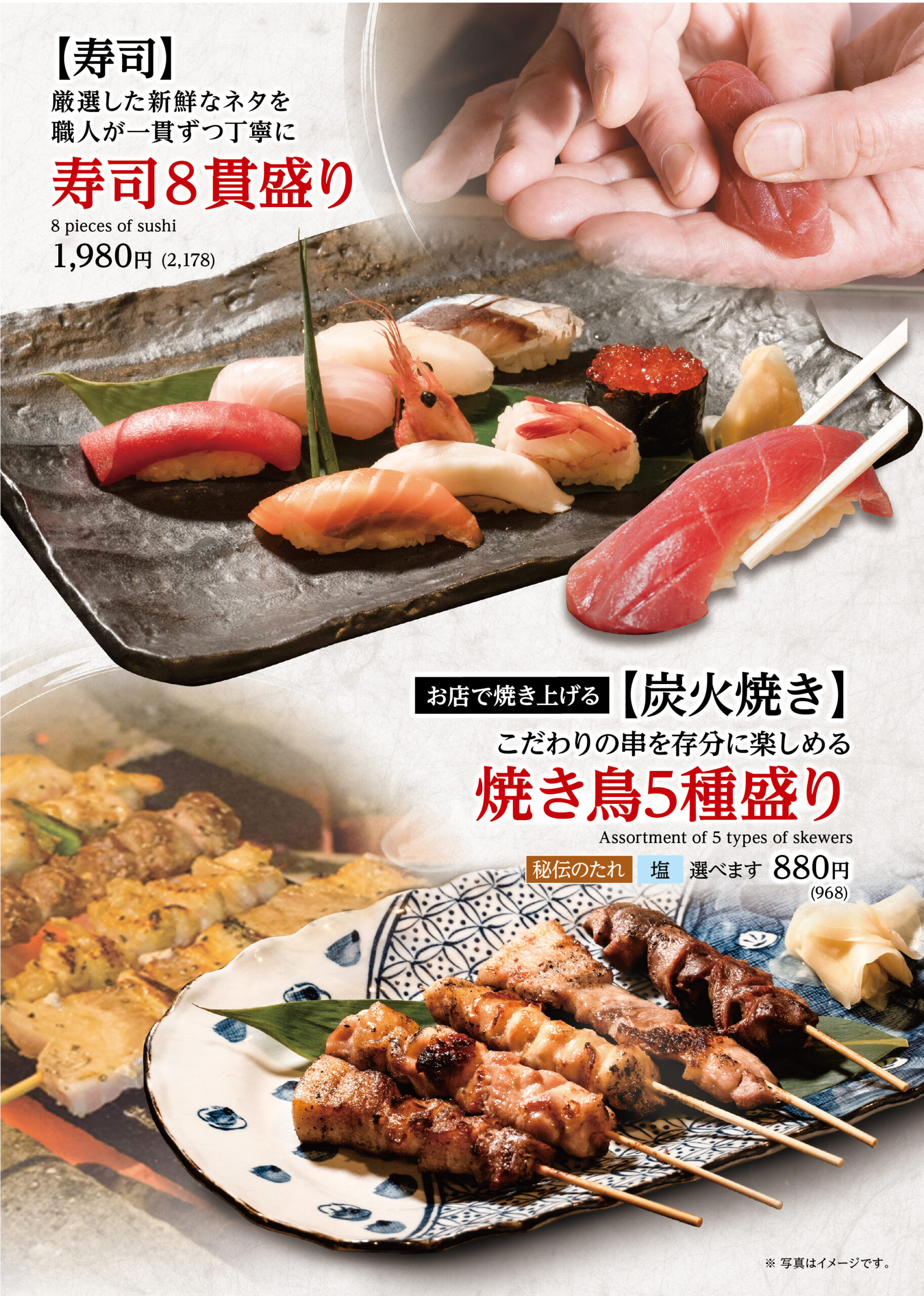 炭焼き・焼鳥はもちろん、職人が握る寿司・鮮魚に自信あり!