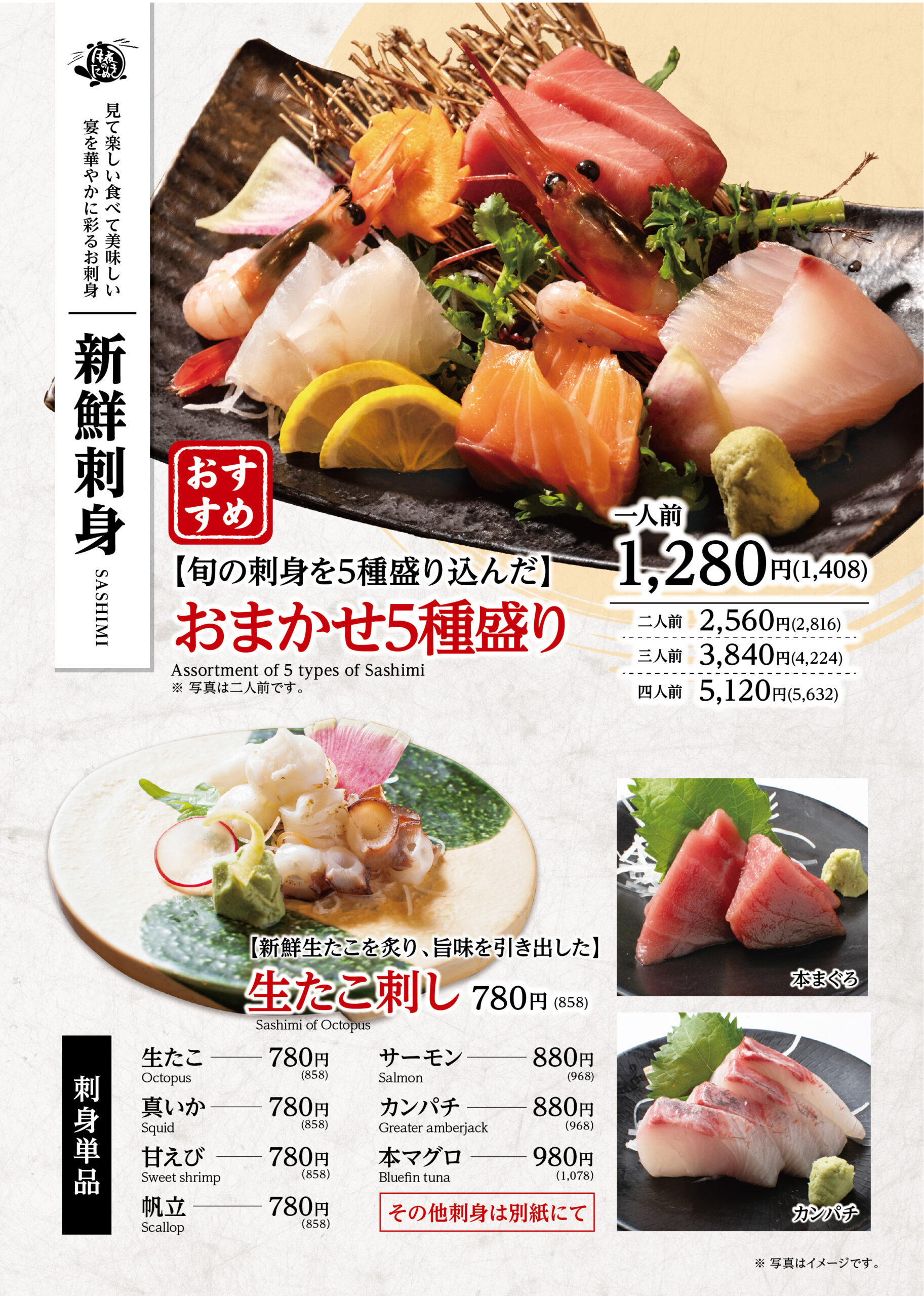 料理長厳選の「刺身盛合せ」も自慢の逸品。